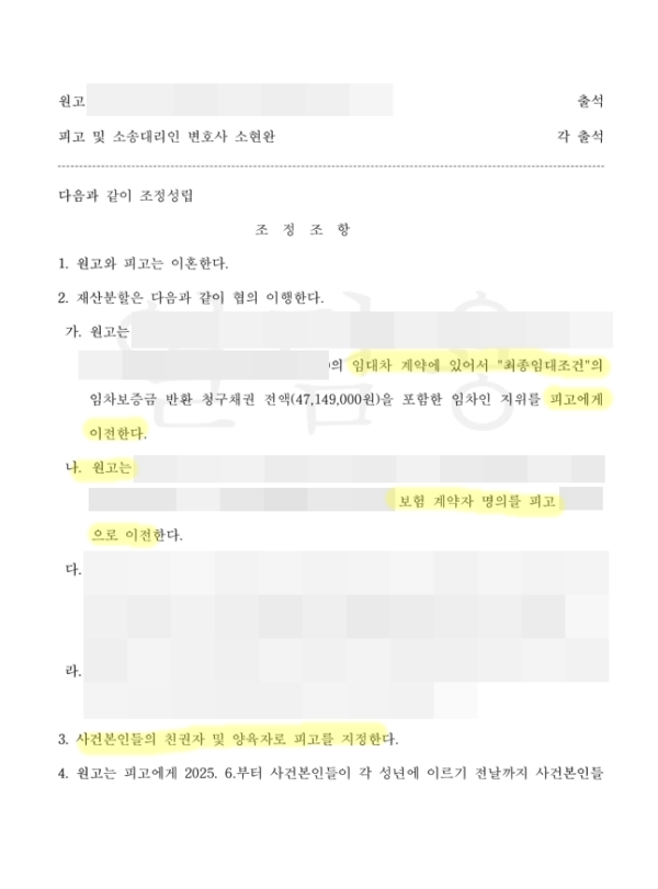 조정 조건자체가 재산의 대부분을 의뢰인에게 귀속시키는 것으로 판단되어 상당히 파격적인 조건이었습니다.