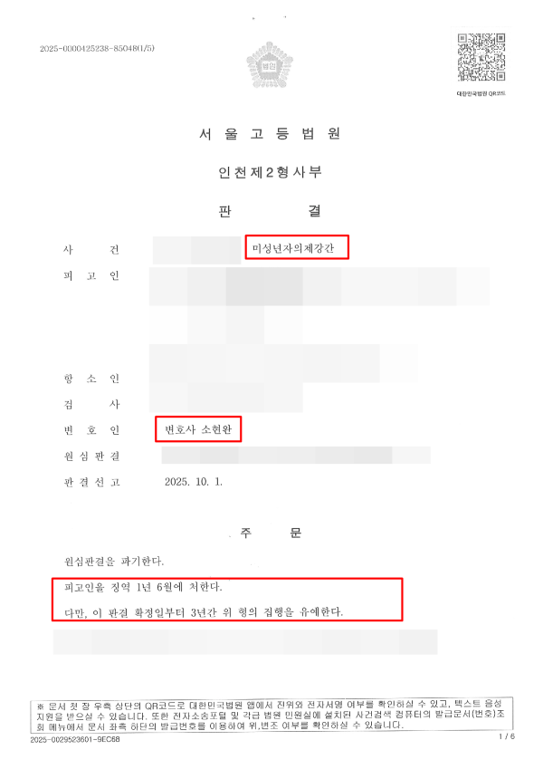 미성년자의제강간은 처벌이 센 편이지만 치열하게 싸운 결과 집행유예로 석방될 수 있었습니다.