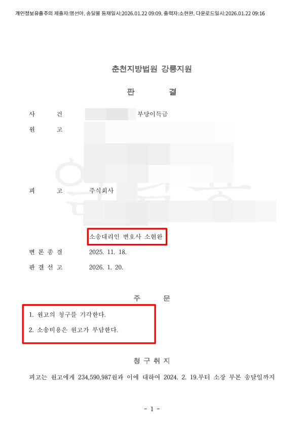 법원은 우리 측의 주장을 전부 받아들여서, 원고가 청구한 2억 3,400만 원 전액을 기각하였습니다.