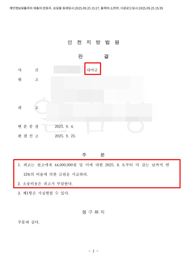 대여금 소송 4,400만원 전액 청구 성공
