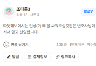 따뜻해보이시는 인상(?) 에 잘 싸워주실것같은 변호사님이셔서 믿고 선임합니다!