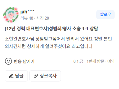 소현완변호사님 상담받고싶어서 멀리서 왔어요 정말 본인의사건처럼 상세하게 알려주셨어요 최고입니다