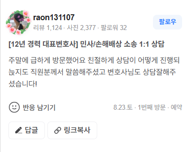 주말에 급하게 방문했어요 친절하게 상담이 어떻게 진행되는지도 직원분께서 말씀해주셨고 변호사님도 상담잘해주셨습니다!
