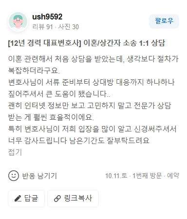 네이버리뷰 네이버 리뷰 2025-10-13 이혼 관련해서 처음 상담을 받았는데, 생각보다 절차가 복잡하더라구요.변호사님이 서류준비부터 상대방 대응까지 하나하 짚어주셔서 큰 도움이 됐습니다.괜히 인터넷 정보만 보고 고민하지 말고 전문가 상담 받는게 훨씬 효울적이에요.특히 변호사님이 저희 입장을 많이 알고 신경 써주셔서 너무 감사드립니다. 남은기간도 잘부탁드려요 목록