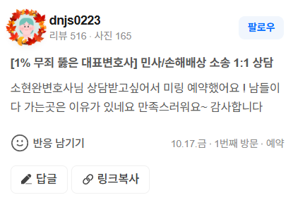 네이버리뷰 네이버리뷰 2025-10-20 [1% 무죄 뚫은 대표변호사] 민사/손해배상 소송 1:1 상담소현완변호사님 상담받고싶어서 미링 예약했어요 ! 남들이 다 가는곳은 이유가 있네요 만족스러워요~ 감사합니다 목록