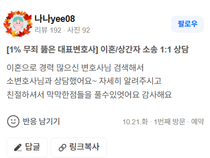네이버리뷰 네이버리 2025-10-27 [1% 무죄 뚫은 대표변호사] 이혼/상간자 소송 1:1 상담이혼으로 경력 많으신 변호사님 검색해서소변호사님과 상담했어요~ 자세히 알려주시고친절하셔서 막막한점들을 풀수있엇어요 감사해요 목록