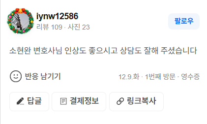 소현완 변호사님 인상도 좋으시고 상담도 잘해 주셨습니다