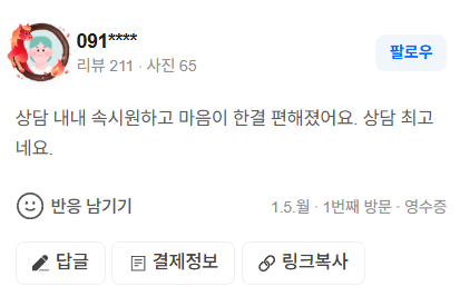 상담내내 속시원하고 마음이 한결 편해졌어요. 상담 최고네요.