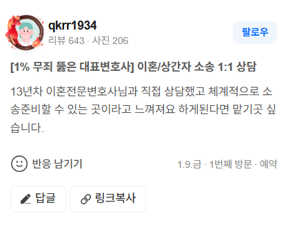 13년차 이혼전문변호사님과 직접 상담했고 체계적으로 소송준비할 수 있는 곳이라고 느껴져요 하게된다면 맡기곳 싶습니다.