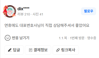 연휴에도 대표변호사님이 직접 상담해주셔서 좋았어요