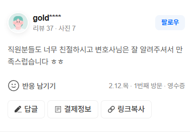 직원분들도 너무 친절하시고 변호사님은 잘 알려주셔서 만족스럽습니다 ㅎㅎ