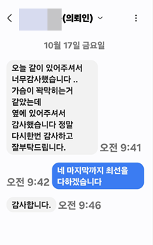 감사문자 의뢰인 감사문자입니다. 2025-10-17 오늘 같이 있어주셔서 너무 감사했습니다.가슴이 꽉막히는거 같았는데 옆에 있어주셔서 감사했습니다.정말 다시한번 감사하고 잘부탁드립니다. 검색 목록