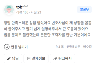 네이버리뷰 네이버 리뷰 2025-09-05 정말 만족스러운 상담 받았어요 변호사님이 제 상황을 꼼꼼히 들어주시고 알기 쉽게 설명해주셔서 큰 도움이 됐어요~ 법률문제로 불안했는데 든든한 조력자를 만난 기분이에요 검색 목록