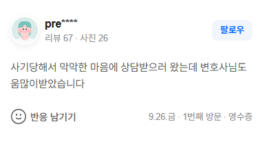 사기당해서 막막한 마음에 상담받으러 왔는데 변호사님도움많이받았습니다