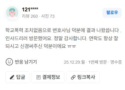 네이버리뷰 네이버리뷰 2026-01-05 학교폭력 조치없음으로 변호사님 덕분에 결과나왔씁니다 . 인사드리러 방문했어요. 정말 감사합니다. 연락도 항상 잘되시고 신경써주신 덕분이에요 ㅠㅠ 검색 목록