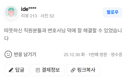 따뜻하신 직원분들과 변호사님 덕에 잘 해결할 수 있었습니다