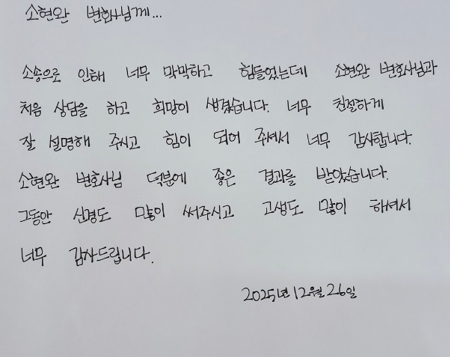 자필후기 의뢰인분께서 보내주신 자필편지입니다. 2025-12-30 소송으로 인해 너무 막막하고 힘들었는데 소현완 변호사님과 처음 상담을 하고 희망이 생겼습니다.너무 친절하게 잘 설명해 주시고 힘이 되어 주셔서 너무 감사합니다.소현완 변호사님 덕분에 좋은 결과를 받았습니다.그동안 신경도 많이 써주시고 고생도 많이 하셔서 너무 감사드립니다. 검색 목록
