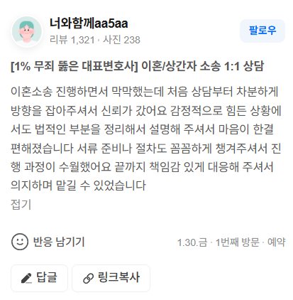 네이버리뷰 네이버리뷰 2026-02-04 이호노송 진행하면서 막막했는데 처음 상담부터 차분하게 방향을 잡아주셔서 신뢰가 갔어요 감정적으로 힘든 상황에서도 법적인 부분을 정리해서 설명해 주셔서 마음이 한결 편해졌습니다 서류 준비나 절차도 꼼꼼하게 챙겨주셔서 진행 과정이 수월했어요 끝까지 책임감 있게 대응해 주셔서 의지하며 맡길 수 있었습니다 목록